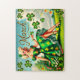 This jigsaw puzzle features a cheerful pin-up girl wearing a vibrant green dress adorned with shamrocks, embodying the spirit of March and St. Patrick's Day. Set against a springtime background, her playful pose and colorful outfit bring luck and joy, creating a vintage celebration of Irish charm.