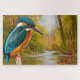 Um martinho pescatore comum é levantado contra um panorama de seu habitat.