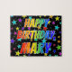 Esta design de quebra-cabeça de quebra-cabeça animada e divertida, com tema de aniversário, tem a mensagem "HAPPY BIRTHDAY, MARY" com os personagens que têm um espectro colorido de arco-íris inspirado em um padrão de gradação, junto com uma estrela excitante molda o plano de fundo. Um quebra-cabeça empolgante como este pode ser uma maneira divertida de enviar uma mensagem de saudação de aniversário a alguém chamado Mary. [~Z0000468]