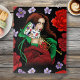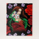 Mulher cabeleira-auburn segurando uma máscara de mascarada veneziana vestindo vermelho e verde num pano de fundo preto com flores vermelhas e roxas