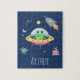 Este quebra-cabeça de crianças bonitinho e moderno apresenta um desenho de alienígena espacial, com um foguete, aliens, estrelas e lua, e pode ser personalizado com o nome de seus garotos. O dom temático azul perfeito para qualquer amante espacial.