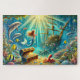 Dive into a dazzling underwater fantasy where a curious mermaid discovers a glowing treasure chest beneath sunlit ocean waters. Dolphins glide nearby, colorful reef fish swirl around coral gardens, and a mysterious shipwreck hints at long-lost adventures. Golden light beams through the sea, illuminating coins, jewels, and sea creatures in motion. Rich with detail and vibrant color, this enchanting artwork offers an immersive and rewarding jigsaw puzzle experience for ocean lovers, fantasy fans, and anyone drawn to magical undersea worlds.