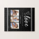 Modern Black Happy Birthday Photo Collage jigsaw puzzle. Celebrate your beloved's birthday with a deeply personal and romantic gift that captures your cherished memories together. This exquisite photo collage puzzle features the loving words 'My Love' in elegant script typography, a heartfelt 'Happy Birthday' message, and space for a name, making it a unique keepsake for her special day. Showcasing three of your favorite photos side-by-side, this puzzle transforms your precious moments into a fun and engaging activity for you and your loved one to complete. The sophisticated black background with subtle white pinstripes adds a touch of class, ensuring it's a beautiful piece of decor even after it's assembled. It's the perfect way to express your enduring affection and create lasting memories for her birthday.