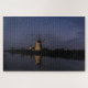 quebra-cabeça de pintura fotográfica com moinhos de vento iluminados históricos com reflexo na água do rio durante a Hora Azul no início da noite, em Kinderdijk, na Holanda.