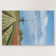 Quebra-cabeça de uma paisagem com moinho de vento e tulipas amarelas e vermelhas sob um céu nublado no campo holandês, num belo dia de primavera na Região do Bulb, Países Baixos.