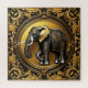 Um elefante preto majestoso, simbolizando força e sabedoria, é representado contra um pano de fundo de intrincada moldura ornamental dourada, expondo um sentido de grandeza e elegância. O contraste entre a silhueta escura do elefante e os detalhes dourados esfregando da moldura cria uma imagem visualmente impressionante e cativante.