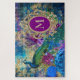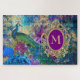Teal vintage elegante e quebra-cabeça de pavão verde personalizado com seu monograma/inicial em um belo quadro de ouro.