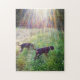 Esta quebra-cabeça apresenta uma foto única de coonhounds caminhando até o rio e a luz do sol espiando pelas árvores em toda sua beleza.