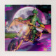 This cool looking Dragon is riding his motorcycle fast and carefree on the open highway.
