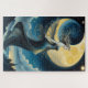 Mulher Cósmica alta com luas na quebra-cabeça de serra de fundo. © Jigsen Wonderland em Zazzle. Uma mulher cósmica etérea alta flutua em frente às luas.