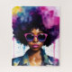 Quebra-cabeça apresenta um trabalho de arte de aquarela vibrante e multicolorido de uma linda menina negra com uma grande cor revestida de arco-íris. A beleza rica em melanina está vestindo óculos de sol e batom rosa. Pequeno efeito de decapagem e gotejamento nesta arte colorida estrelando uma mulher de pele castanha da diáspora africana.