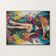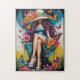Elevem sua coleção de quebra-cabeça com este design chic e em moda apresentando uma na moda-mulher se reclinando em um chapéu de flor grande e saltos altos. A trabalho de arte mostra rosas vibrantes e tinta pingando em um belo estilo de aquarela, combinando elementos de boho e florais para um olhar verdadeiramente único e inovador.