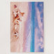 Linda paisagem romântica com conchas doces ligeiramente rosa na praia. A onda lava suavemente a costa, nuvens cor-de-rosa estão flutuando no céu azul. A atmosfera do paraíso e da serenidade.