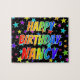 Este design de quebra-cabeça de quebra-cabeça vibrante, com tema de aniversário, tem a mensagem "FELIZ ANIVERSÁRIO", com os personagens que têm um espectro colorido do arco-íris inspirado num padrão de gradação, além de um padrão de fundo de estrelas divertidas. Um quebra-cabeça excitante como este pode ser usado para enviar desejos de aniversário a alguém chamado Nancy. [~Z0000468]
