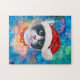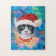 Feriado de Natal de Gato Negro e Branco Bonito Apresenta uma aquarela de um gato preto com um chapéu de Papai noel vermelho e uma coleira de gato de Natal vermelha, e um fundo com uma galáxia colorida de cor d'água.