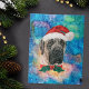 O Natal do Mastiff Breed Dog apresenta uma aquarela de um Mastiff Inglês com um Chapéu Papai noel vermelho, uma coleira vermelha de Natal e uma aquarela galáxica.