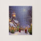 Esta quebra-cabeça de serra tem uma imagem de uma vintage bela vila de Natal numa noite de neve.
