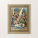 pintura vintage encantadora da cena da natividade com madonna e criança, joseph, três sábios com presentes, e multidões de pessoas do lado de fora, com um lindo raio de luz tocando no jesus bebê que levantou a mão em uma saudação.