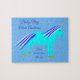 Este quebra-cabeça espetacular apresenta uma imagem de arte digital de um lindo e mágico unicórnio bebê azul. O corpo principal do unicórnio é azul e o homem e a cauda são dois tons diferentes de azul. O unicórnio tem cascos de ouro e uma buzina brilhante de ouro sobre sua cabeça. Tem um olho em forma de diamante azul. O unicórnio tem um grande sorriso no seu rosto. Há texto personalizado para que você possa incluir o nome, a data de nascimento e o peso à nascença do bebê. Isso seria um belo presente de anúncio de nascimento para amigos e família.