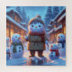Um bonitão de bochecha rosada, vestido com roupas quentes de inverno, fica orgulhoso em uma vila nevada. Ele está cercado por suas criações: três bonitinhos de neve de tamanhos variados. O brilho quente das casas da vila ilumina a cena, criando uma atmosfera acolhedora e festiva.