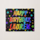 Este design de quebra-cabeça animado, vibrante e com tema de aniversário apresenta a mensagem "HAPPY BIRTHDAY, LAUREN" com os personagens que têm um espectro colorido de arco-íris inspirado em um padrão de gradação, junto com uma estrela divertida forma o padrão de fundo. Um quebra-cabeça empolgante como este pode ser uma maneira divertida de enviar uma mensagem de saudação de aniversário a alguém chamado Lauren. [~Z0000468]