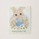 Coelhinho de Páscoa bonito com quebra-cabeça de serra de ovo azul. Personalize facilmente o texto. Kate Eden Art.