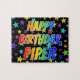 Este animador e animado design de quebra-cabeça de quebra-cabeça com tema de aniversário tem a mensagem "HAPPY BIRTHDAY, PIPER" com os personagens que têm um espectro colorido de arco-íris inspirado em um padrão de gradação, junto com um campo vibrante de estrelas como padrão de fundo. Um quebra-cabeça vibrante como este pode ser uma maneira divertida de enviar cartões de aniversários a alguém chamado Piper. [~Z0000468]
