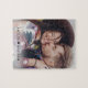 Esta quebra-cabeça de serra para casais mostra sua foto romântica com seus nomes para personalizar em uma simples tipografia negra minimalista unida por um coração. Desenhada pela artista Susan Coffey.