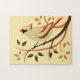 Arte de aves estilizada de um cardeal fêmea Norte empoleirada em galho decorativo com folhas em cor de outono