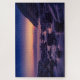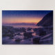 A Hora Azul - quebra-cabeça colorida apresenta fotografia da paisagem da orla do oceano rochoso com reflexo de blues, céu rosa e roxo.