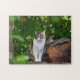 Um gato se senta no jardim verde, próximo a um tronco e olha à frente