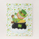 O design doce e festivo, configurações bonitos de um leprechaun dos desenhos animados empoleirou-se em cima de um pote de ouro preto contra um fundo de multi trevos coloridos.