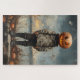 A imagem mostra uma figura em um cenário ao ar livre, vestindo um equipamento militar robusto e vestido com botas. Em vez de uma cabeça, a figura tem uma abóbora esculpida grande com uma face ameaçadora e brilhante de jack-o-lanterna. O céu está ensopado, dando à cena uma atmosfera sombria, e o chão está espalhado por vegetação seca e duas pequenas abóboras, enfatizando o tema do Halloween. O estilo da pintura lembra a Americana clássica, evocando uma sensação de nostalgia e desconforto.