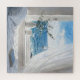 An open window showcases a breathtaking ocean view with a sailboat on the waves, while a cozy bed, a book, a white coffee mug, and a vase of eucalyptus enhance the room's charm