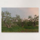 quebra-cabeça com múltiplas oliveiras e algumas flores vermelhas num olival durante o pôr do sol na Itália.