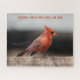 Um quebra-cabeça divertido para qualquer observador/amante de pássaros! Fotografia de um lindo cardeal norte vermelho, posando na árvore. O ditado carinhoso sobre cardeais e anjos está impresso no topo da foto: Cardinais aparecem quando anjos estão próximos.