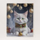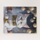 Este quebra-cabeça retrata um gato branco vestindo uma tigela verde e dourada, sentada em frente a presentes de Natal e ornamentos de ouro na neve.