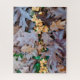 Essa quebra-cabeça apresenta uma imagem desafiadora de alguns pequenos cogumelos amarelos crescendo entre as folhas castanhas caídas de uma árvore