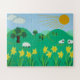 A ilustração de crianças originais e bonitinhas nesta quebra-cabeça de serra é pintada em um estilo "peneiro", é brilhante e colorido. a imagem mostra algumas ovelhas brancas e esbranquiçadas e pretas pairando atrás dos narcisos na encosta da colina, o céu é azul com nuvens lisas e o sol está brilhando. Ao fundo vocês podem ver algumas folhas cobertas de árvores verdes com maçãs vermelhas nelas. Esta pintura infantil é fácil de montar porque as imagens são pintadas em boas cores sólidas com contornos exatos. Este quebra-cabeça será apreciado por todas as idades.