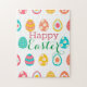 Texto moderno em rosa e verde com padrão de ovo de Páscoa.