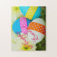 quebra-cabeça de serra de 11" x 14" personalizável com uma imagem de ovos de Páscoa brancos e azuis embrulhados em fitas de bolinhas coloridas sobre grama verde em meio a crisântemos branco bonito. Veja toda a coleção de Quebra-cabeça de Páscoa na categoria HOME na seção HOLIDAYS.