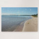 Uma extensão pacífica de costa ao longo da Baía Big Traverse no Lago Superior, onde ondas suaves se encontram com areia macia sob um céu azul brilhante. A praia curva e a água calma capturam a beleza tranquila e aberta da Península Superior de Michigan.