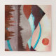 Paisagem de montanha em vermelho e azul com um lago e um arco-íris azul arrojado.