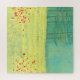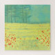 Uma pintura moderna e contemporânea com uma flor pacífica encheu o campo de verão com pássaros voando contra o céu e uma floresta de pinheiros à distância. Cores frescas e elevatórias amarelas e verdes. Arte original de Nic Squirrell.