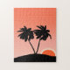 Quebra-cabeça em uma silhueta preta de palmeiras em uma ilha tropical, sobre um fundo laranja sunset