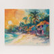 Um John Dyer inspirou o paraíso da praia tropical, o pôr do sol e casas de praia olhando para as águas. Esta pintura a aquarela é detalhada, mas minimalista.