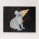 Uma bela ilustração de uma festa koala e diversão! Urso Koala vestindo um chapéu de festa e soprando buzina com confete chovendo nele. Que comecem as celebrações! Perfeito para quem adora ilustrações animais engraçadas. Ideal para um presente de aniversário, decoração infantil, arte infantil de quarto, decoração doméstica, presente de Natal ou presente para qualquer outra ocasião especial.