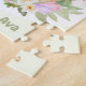 Quebra-cabeça com um coelho com um ovo roxo, flores rosadas e roxas, de Páscoa branca. Personalize facilmente o texto. Kate Eden Art.