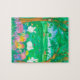 Uma quebra-cabeça de Páscoa brilhante e colorida, com três curiosos coelhos brancos a olhar para ovos de Páscoa brilhantes num campo de primavera com uma coruja tímida numa árvore e um croco roxo florescente. presente divertido para o feriado!
