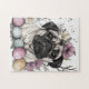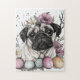 Páscoa de cachorrinho de cor d'água quebra-cabeça floral. Cãozinhos de água russa e taças de cor pastel de estilo linear com ovos de Páscoa e botânicos florais.